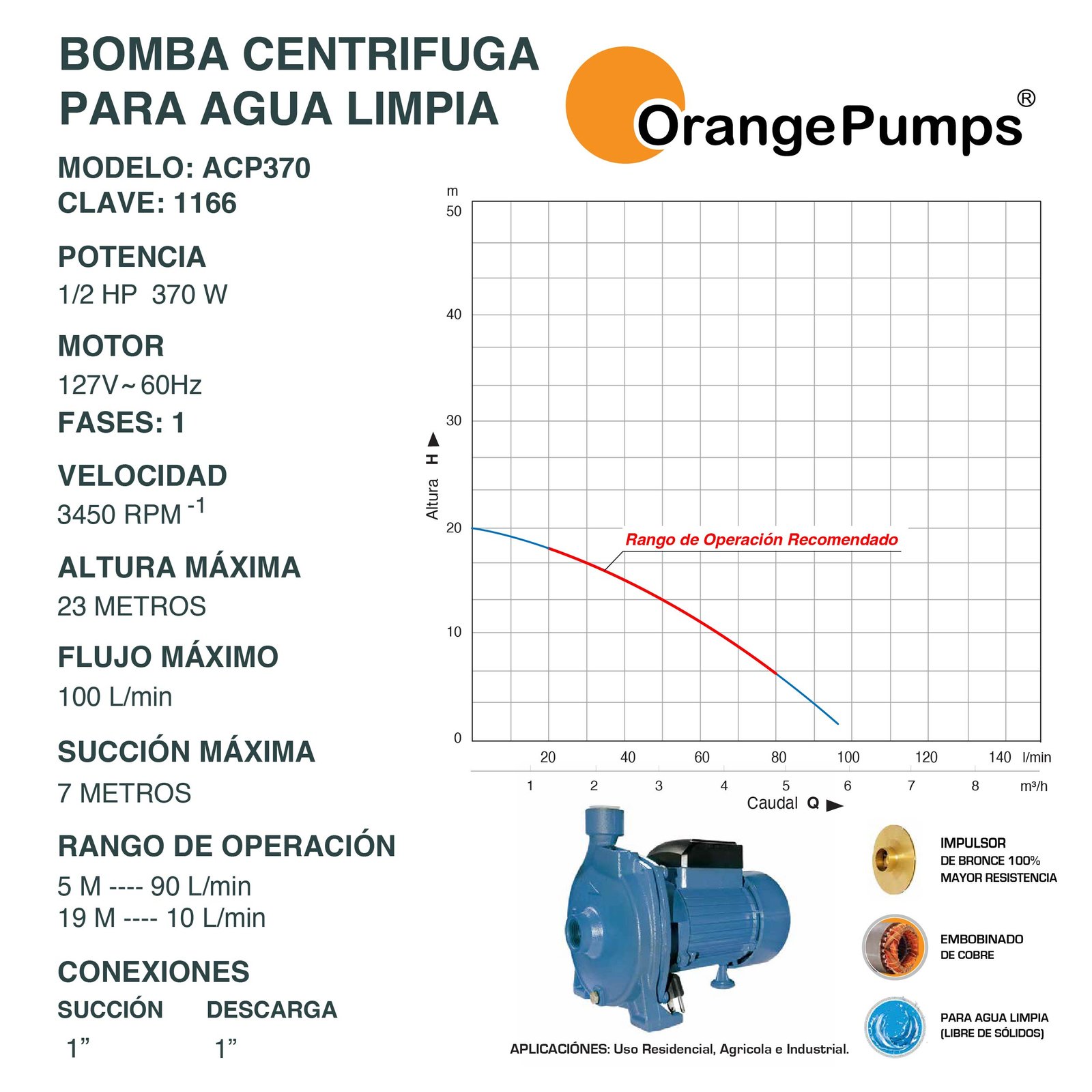 1/2 HP – MOTOR 127V – 60HZ 1F – ALTURA MÁXIMA 23 MTS -DESCARGA 1″ – SUCCION 1″ – 100 L/min