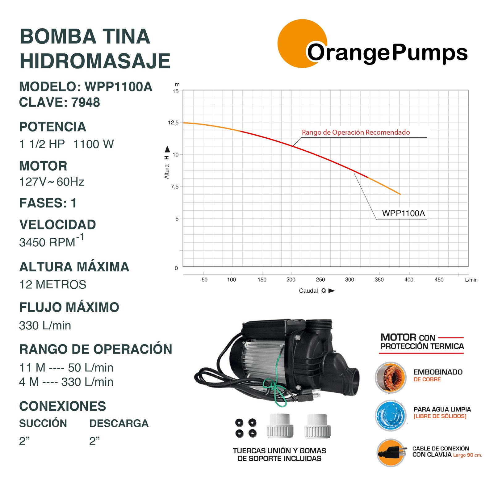 1 1/2 HP – MOTOR 127V – 60HZ 1F – ALTURA MÁXIMA 11 MTS – ALTURA MÍNIMA 4 MTS – DESCARGA 2″ NPT – SUCCION 2″ NPT – 300 L/min