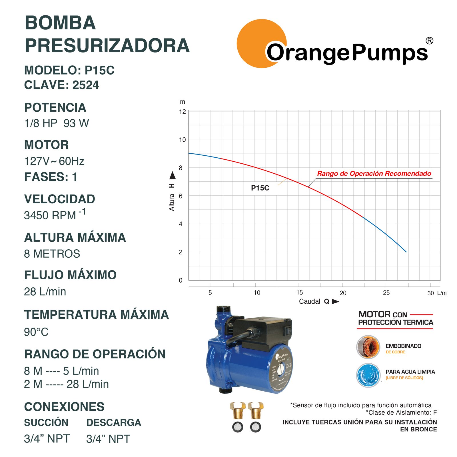 1/8 HP – MOTOR 127 V – 60HZ 1F – ALTURA MÁXIMA 8 MTS -DESCARGA NPT 3/4″ – SUCCION NPT 3/4″ – 28 L/min