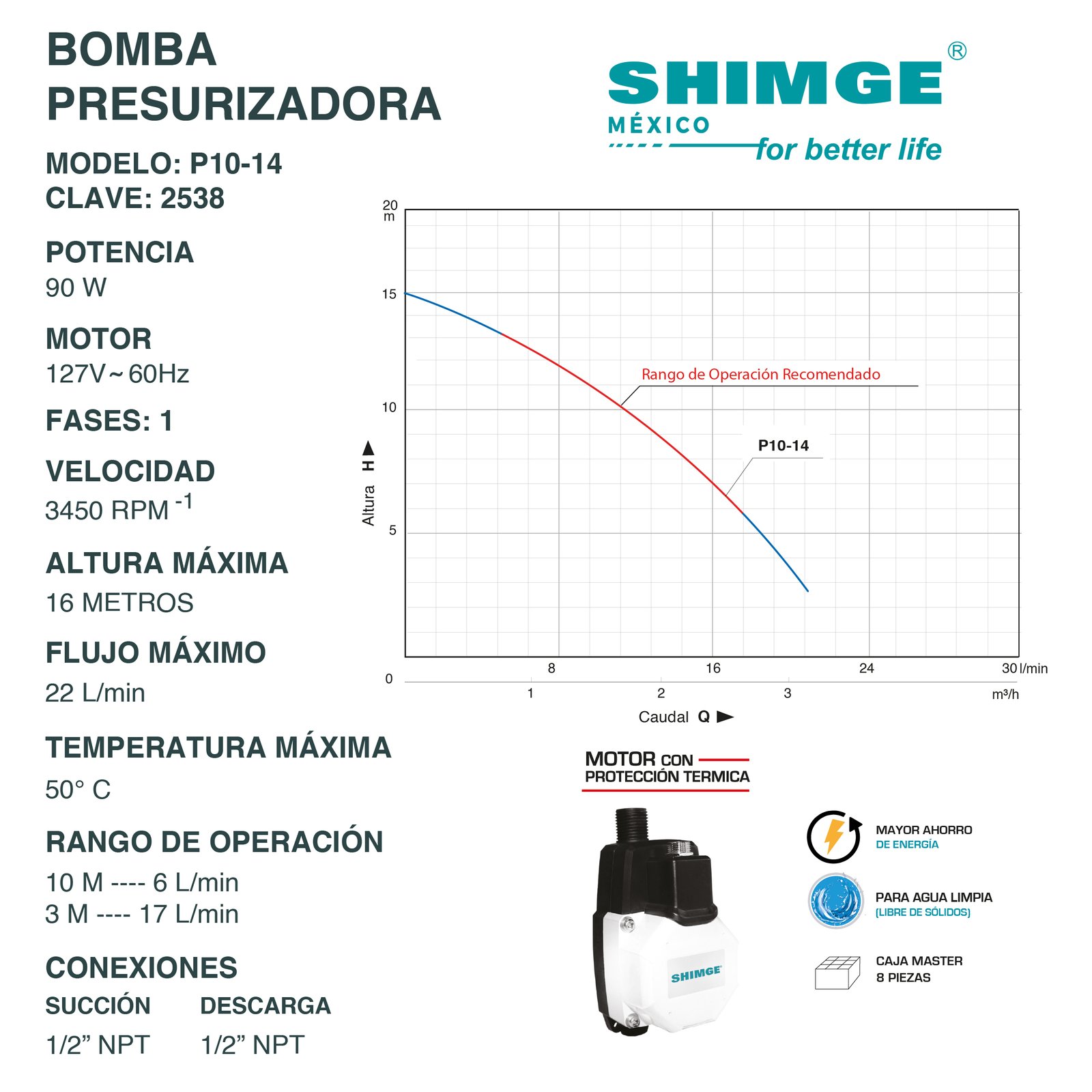 90 W – MOTOR 127V – 60HZ 1F – ALTURA MÁXIMA 16 MTS – CONEXIONES SUCCION 1/2″ NPT – DESCARGA 1/2″ NPT – 22 L/min