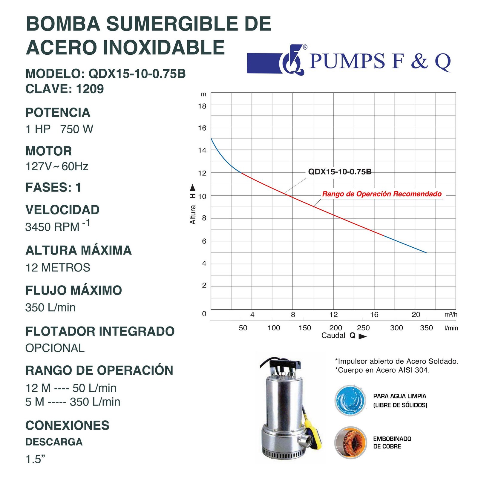 1 HP – MOTOR 127V – 60HZ 1F – ALTURA MÁXIMA 12 MTS – ALTURA MÍNIMA 5 MTS -DESCARGA 1.5″ – 350 L/min – Flotador opcional