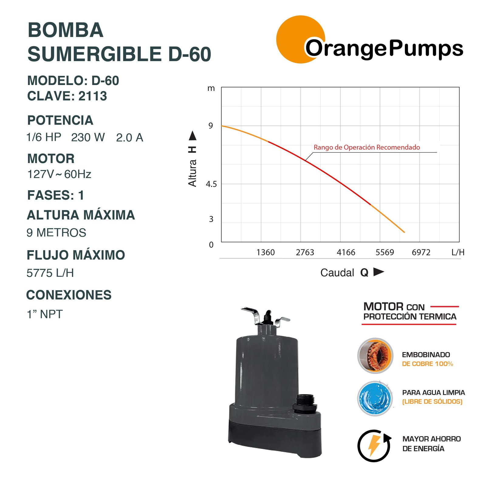 1/6 HP 230 W – MOTOR 127V – 60HZ 1F – ALTURA MÁXIMA 9 MTS – CONEXION NPT 1″ – 5775 L/H