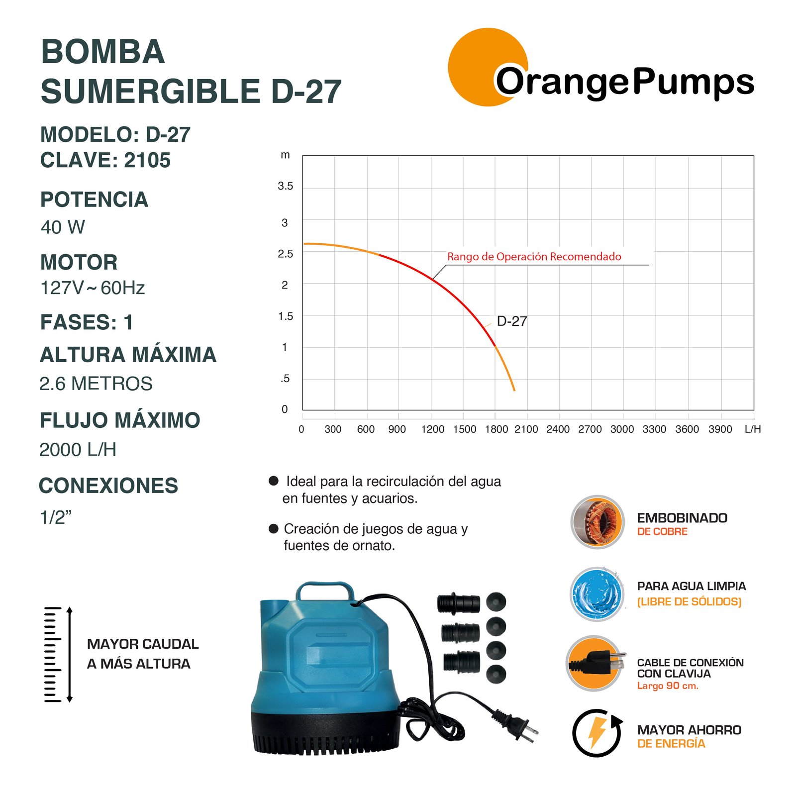 40 W – MOTOR 127V – 60HZ 1F – ALTURA MÁXIMA 2.6 MTS – CONEXIONES 1/2″ – 2000 L/H