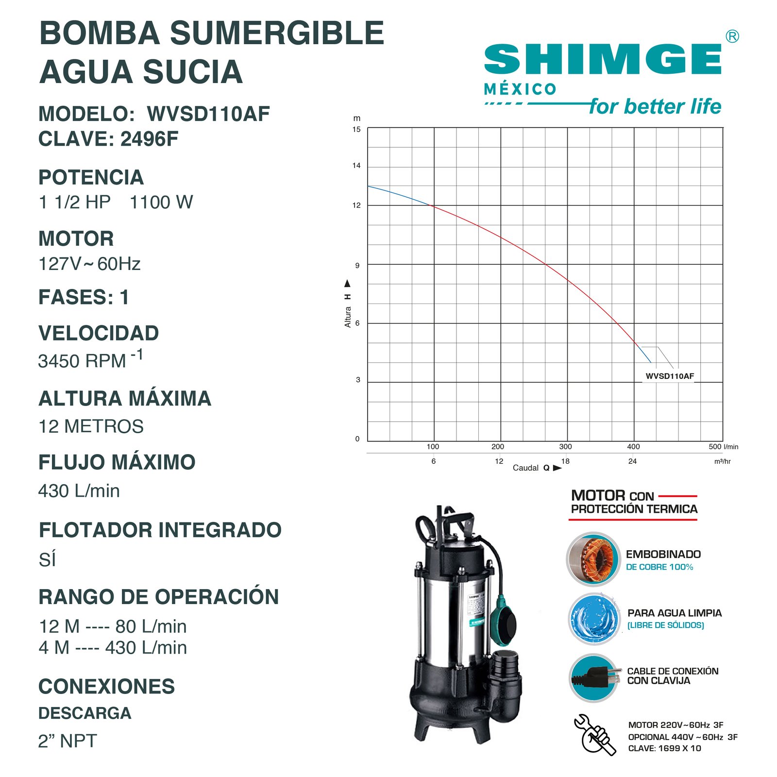 1 1/2 HP – MOTOR 127 V – 60HZ 1F – ALTURA MÁXIMA 12 MTS – ALTURA MÍNIMA 4 MTS – DESCARGA NPT 2″ – 430 L/min – Flotador Integrado