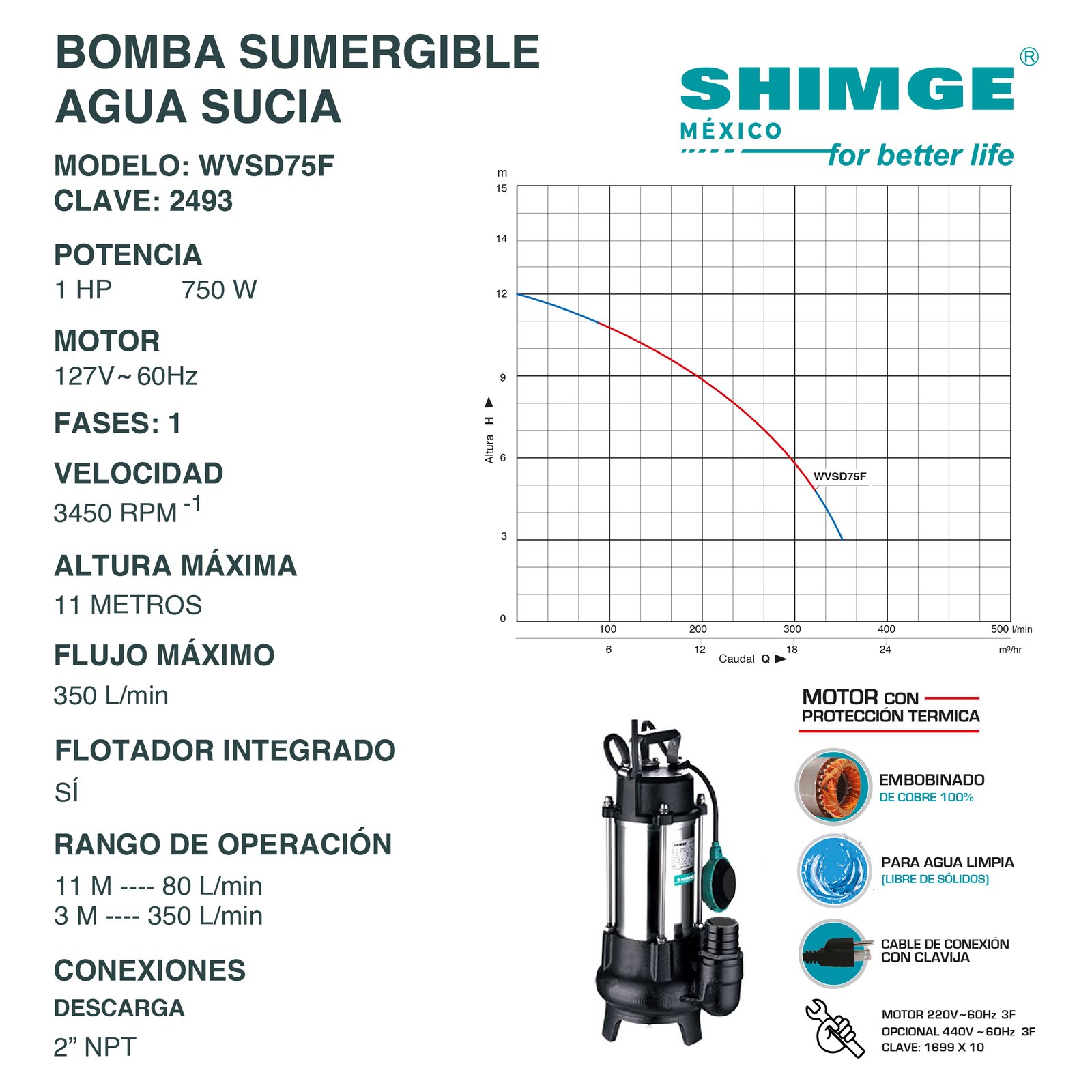 1 HP – MOTOR 127 V – 60HZ 1F – ALTURA MÁXIMA 11 MTS – ALTURA MÍNIMA 3 MTS – DESCARGA NPT 2″ – 350 L/min – Flotador Integrado