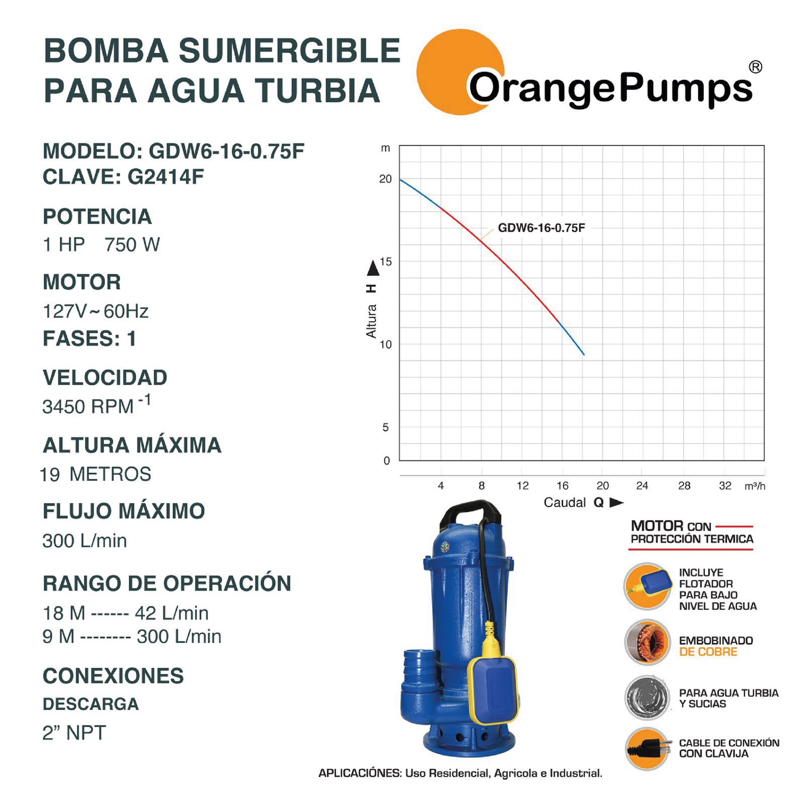 1 HP – MOTOR 127V – 60HZ 1F – ALTURA MÁXIMA 19 MTS – ALTURA MÍNIMA 9 MTS – DESCARGA NPT 2″ – 300 L/min – Flotador Integrado