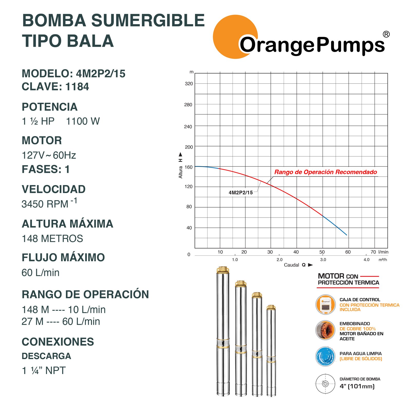 1 1/2 HP – MOTOR 127V – 60HZ 1F – ALTURA MÁXIMA 148 MTS – ALTURA MÍNIMA 27 MTS – DESCARGA NPT 1 1/4″ – 60 L/min