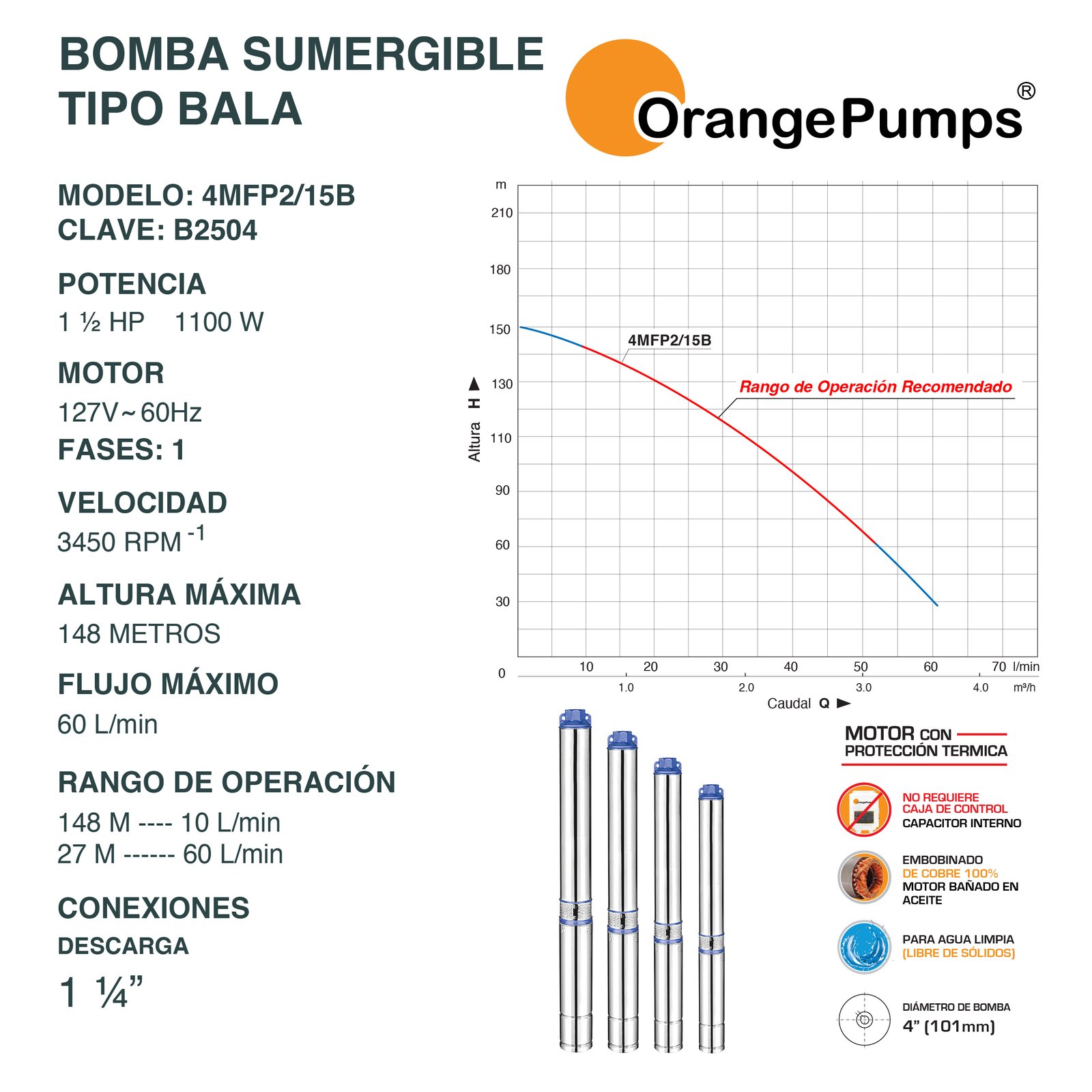 1 1/2 HP – MOTOR 127V – 60HZ 1F – ALTURA MÁXIMA 148 MTS – ALTURA MÍNIMA 27 MTS – DESCARGA NPT 1 1/4″ – 60 L/min
