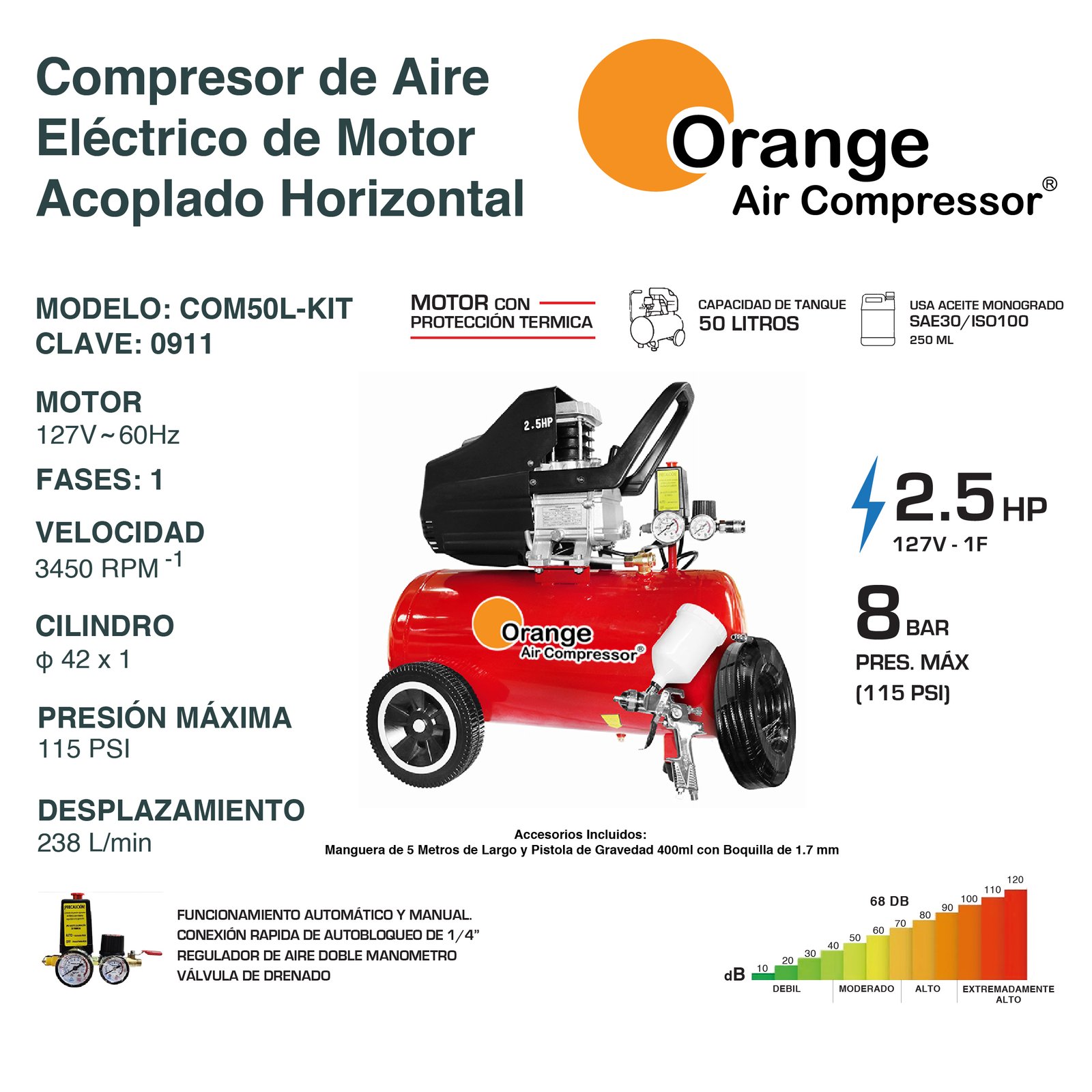 Capacidad Tanque: 50 Lts – Potencia: 2.5 HP / 1800 W – Corriente: 16 A – Frecuencia: 127 V / 60 Hz – Velocidad: 3450 rpm – Presión máxima: 115 PSI – Desplazamiento: 238 L/min – Nivel de ruido: 90 – 100 dB – Incluye: Manguera, Pistola con vaso y accesorios.