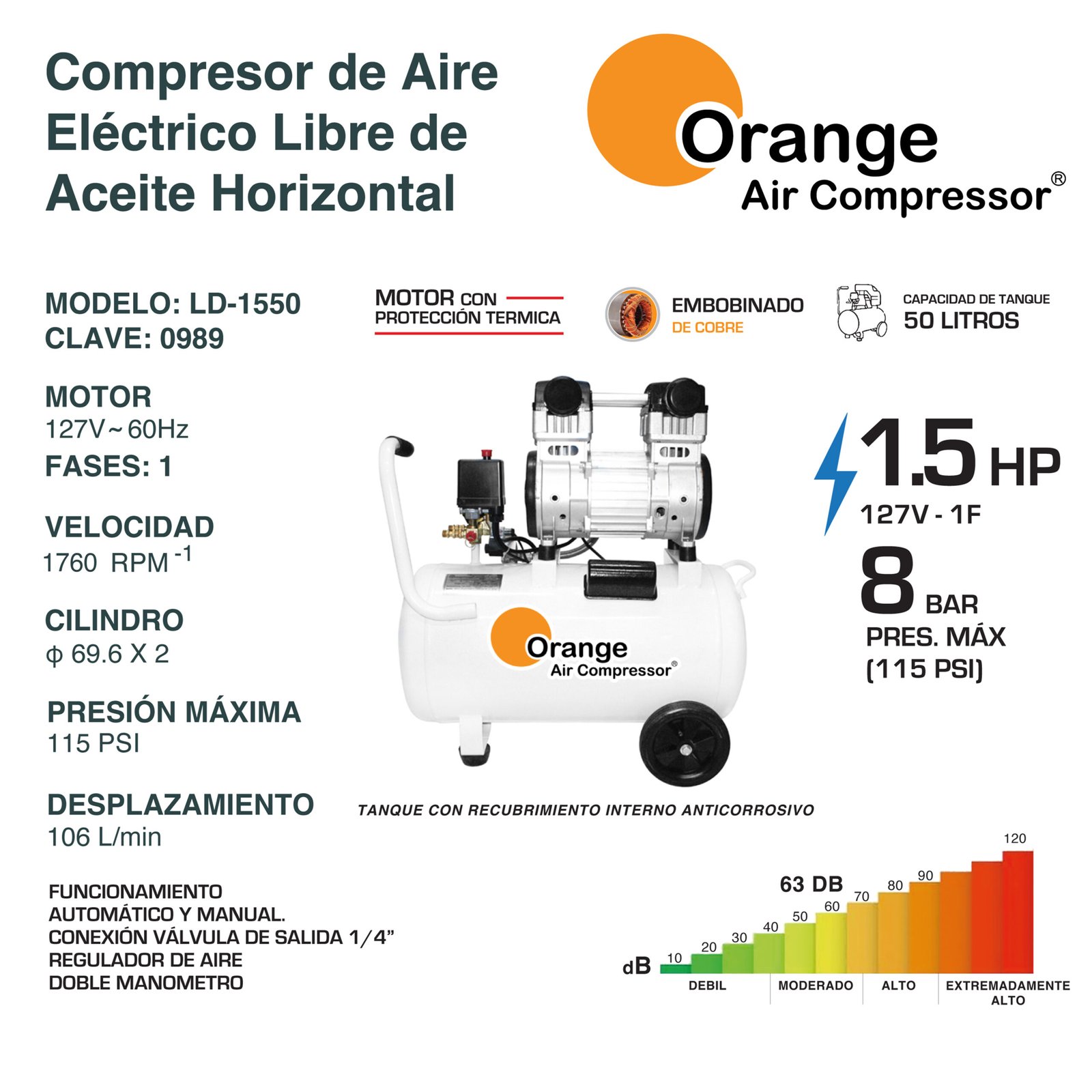 Capacidad Tanque: 50 Lts – Potencia: 1.5 HP / 1100 W – Frecuencia: 127 V / 60 Hz – Velocidad: 1760 rpm – Presión máxima: 115 PSI – Desplazamiento: 106 L/min – Nivel de ruido: 70 – 90 dB