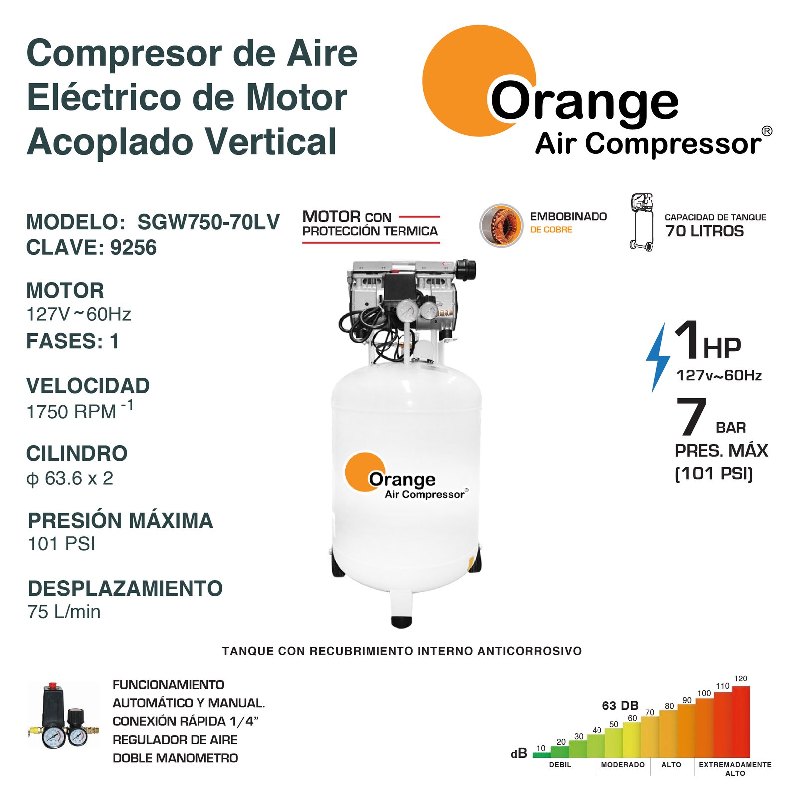 Capacidad Tanque: 70 Lts – Potencia: 1 HP / 750 W – Frecuencia: 127 V / 60 Hz – Velocidad: 1750 rpm – Presión máxima: 101 PSI – Desplazamiento: 75 L/min – Nivel de ruido: 70 – 80 dB